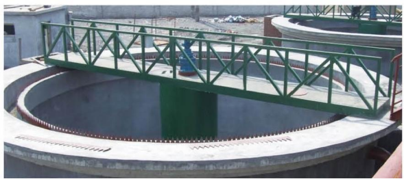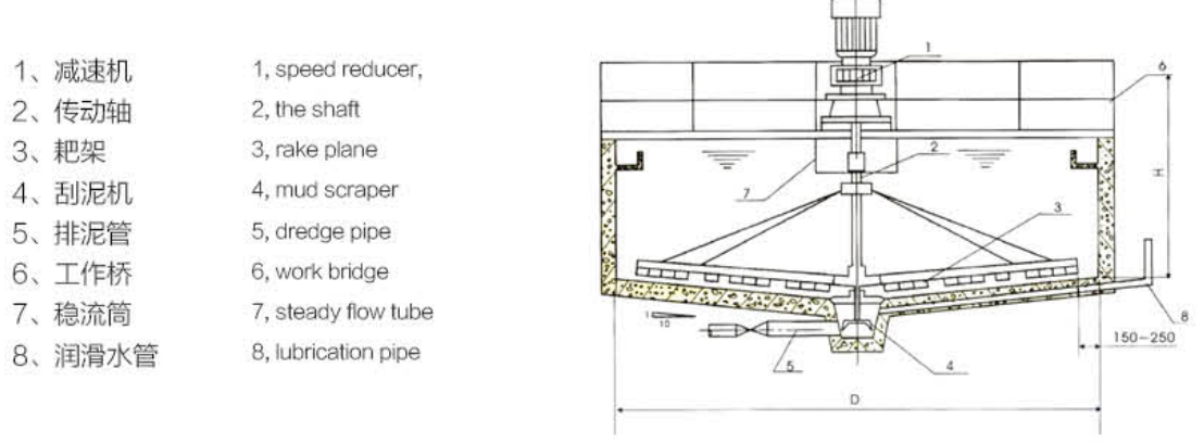 ?GZX型中心傳動刮吸泥機(jī)廣泛用于給水工程中的沉淀池排泥,整機(jī)載荷都作用在工作橋中心。污水經(jīng)中心穩(wěn)流筒布水后流向周邊溢水槽,隨著流速的降低,污水中的懸浮物被分離而沉降于池底,由刮板將沉淀的污泥刮集到中心集泥槽中,靠靜水壓力將其從污泥管排出。